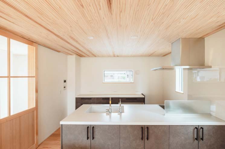 家を建てることは、未来の暮らしを想像すること。頭の中のふわふわとしたイメージを、具体的な形にしていく中で「家族が安⼼して⼼地よく住める」という軸を⼤切にされた⼆⼈。こだわったのは、家族が⼀緒に過ごす時間が⻑いリビングでした。「広さを感じられる空間にしてくださり、ゆったりと過ごせそうです。想いを形にしてくださるので、お任せしっぱなしで(笑)。いくつも間取りを考えてもらいました」と奥様。⼤きな窓を設け、床と天井に使った杉材がより外と内のつながりを感じさせてくれます。