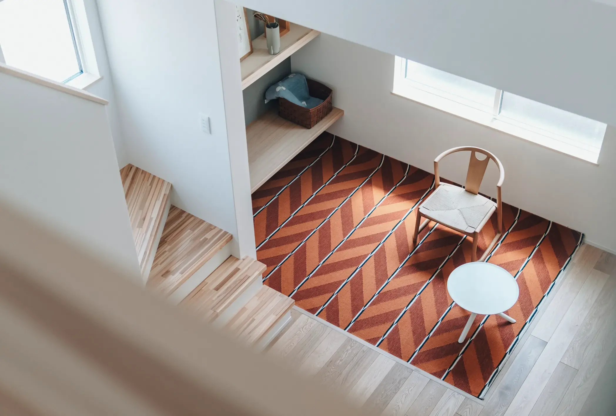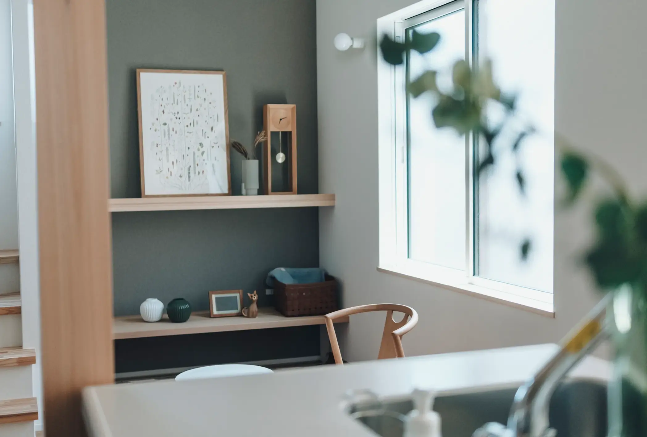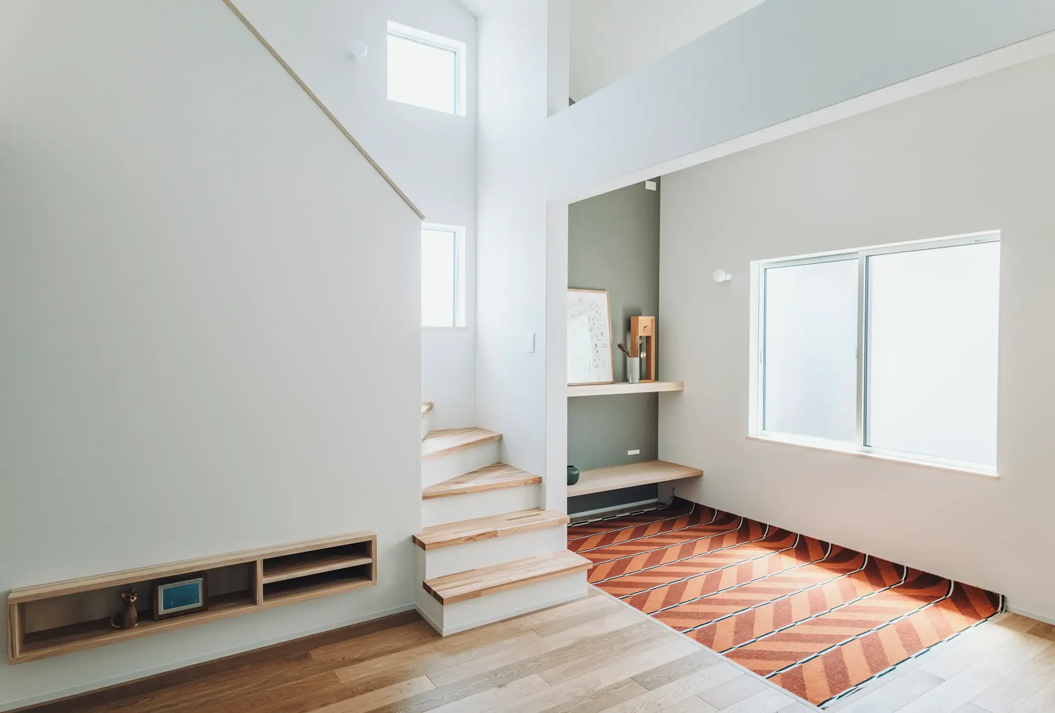 家で過ごす時間の多いご家族。生活リズムが違っても、同じ空間に安心感が生まれるよう間取りを考えました。キッチンの隣には畳コーナーを設け、料理の音やお子様の気配を感じながら、自然とそばにいられる居場所に。吹き抜けのリビングは上下に視線が抜け、離れていても家族の存在がやさしく伝わります。寝室は1階に配置し、今もこれからも無理なく暮らせる住まいとしました。
