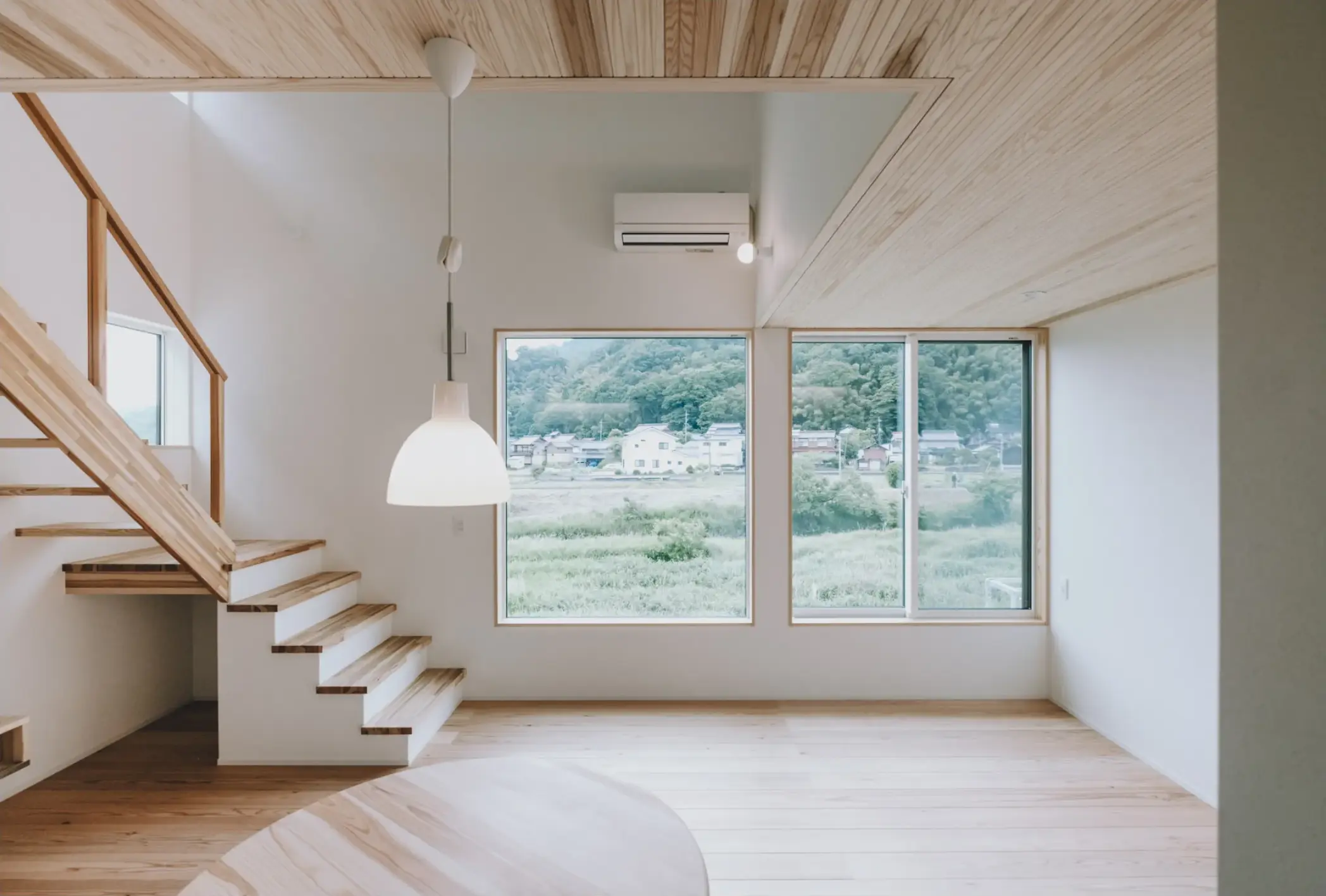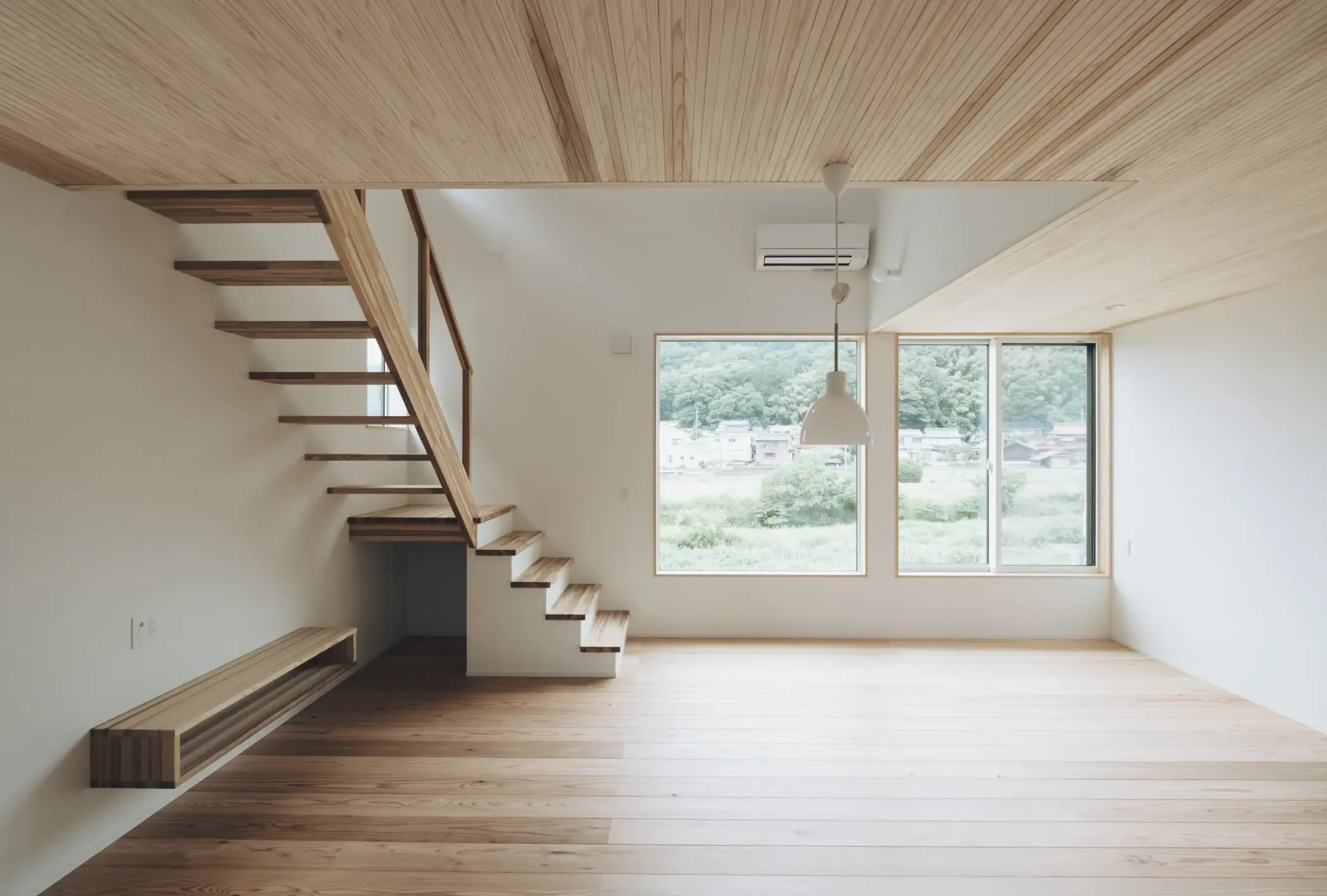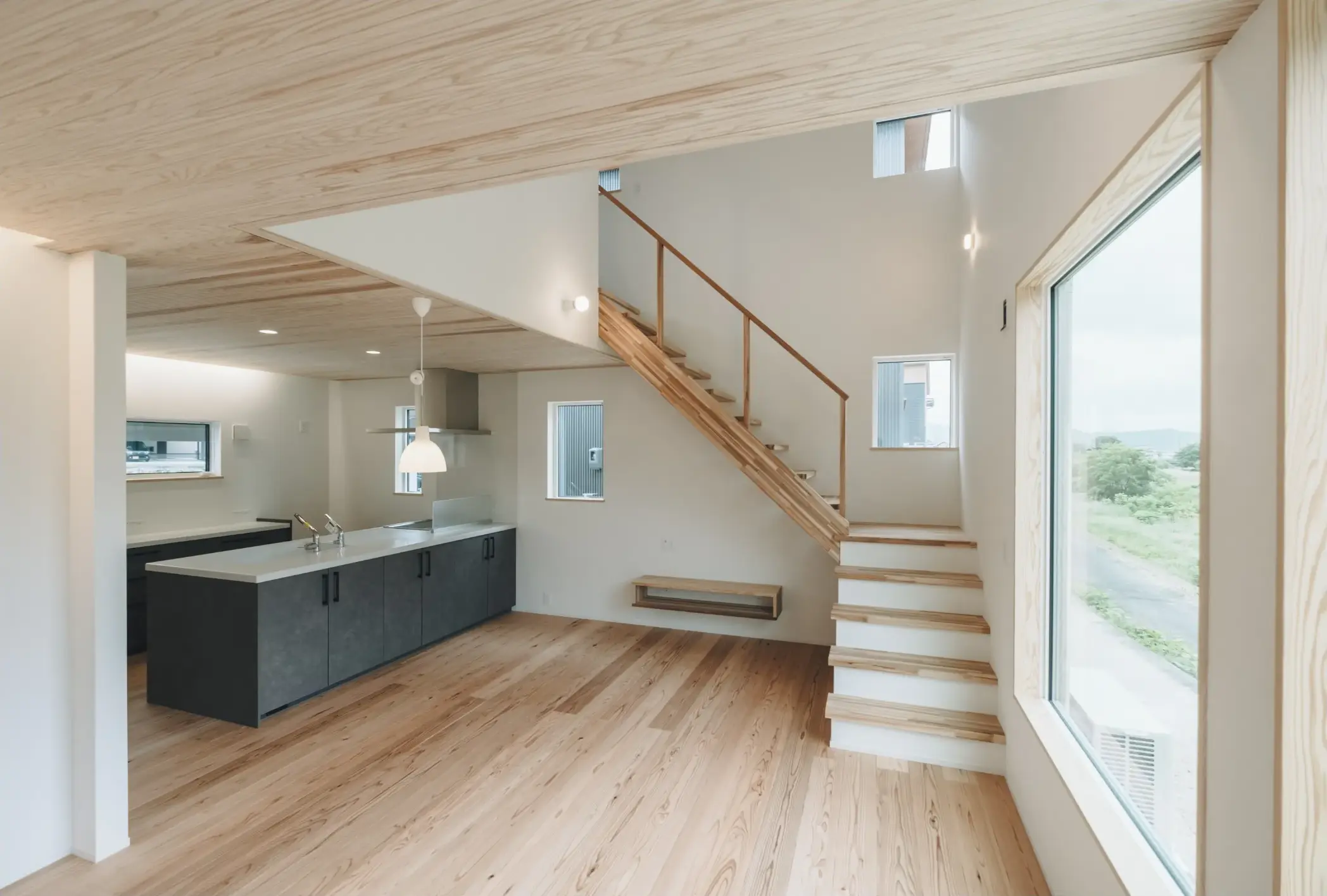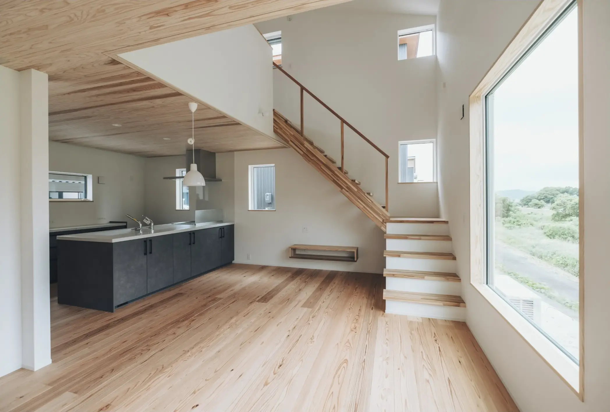 山と川の景色が、日々の暮らしの背景になるよう、窓の位置や視線の抜けを丁寧に整えました。室内にいながら四季の移ろいを感じられます。リビングは天井を高くとり、やわらかな光が空間全体に広がる設えに。無垢材の床や天井は、光を受けて表情を変え、時間とともに暮らしに馴染み、味わいを深めていきます。借景に取り込んだ自然、無垢の質感、吹き抜けの空間。それらが調和し、心が静かに落ち着く住まいとなりました。