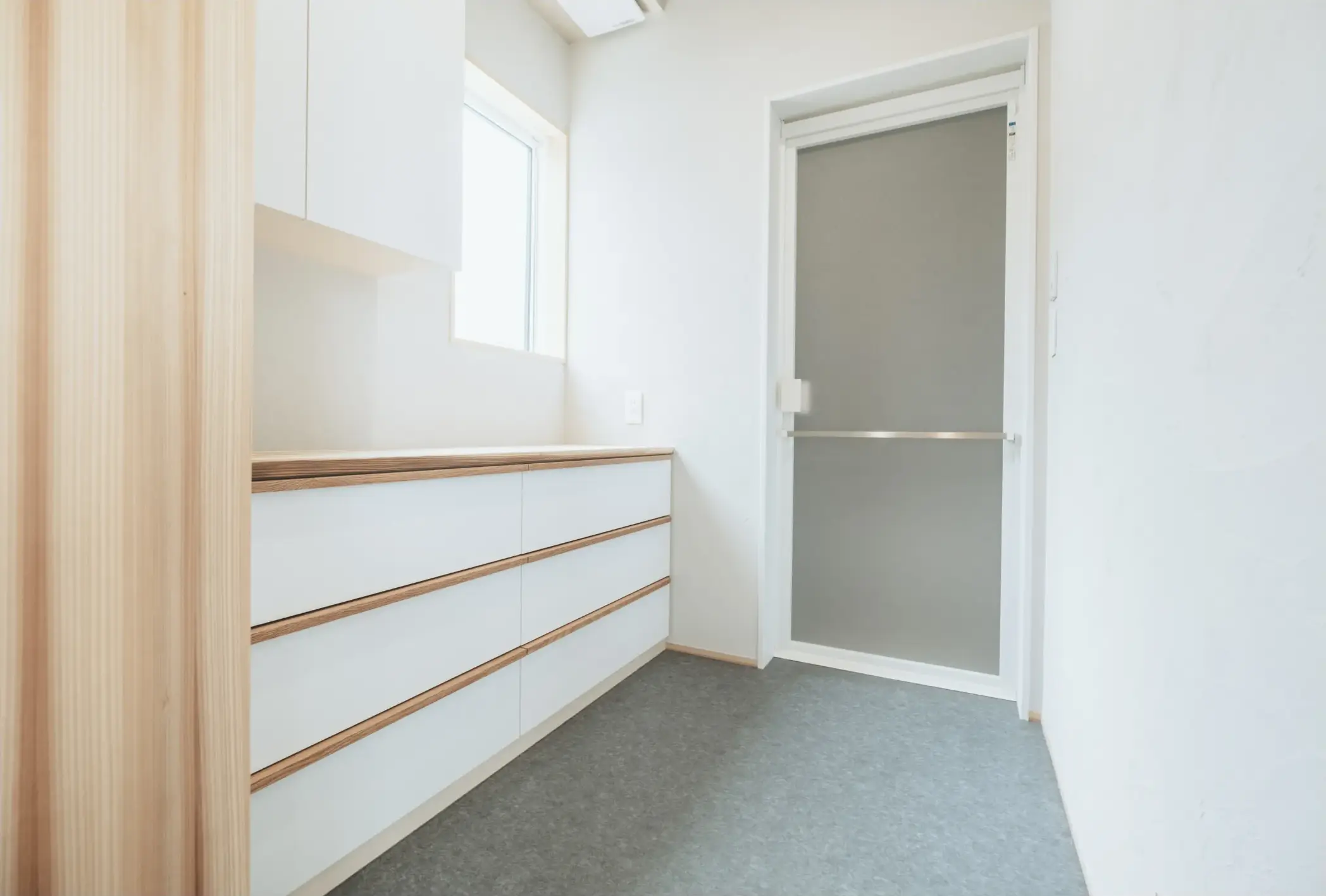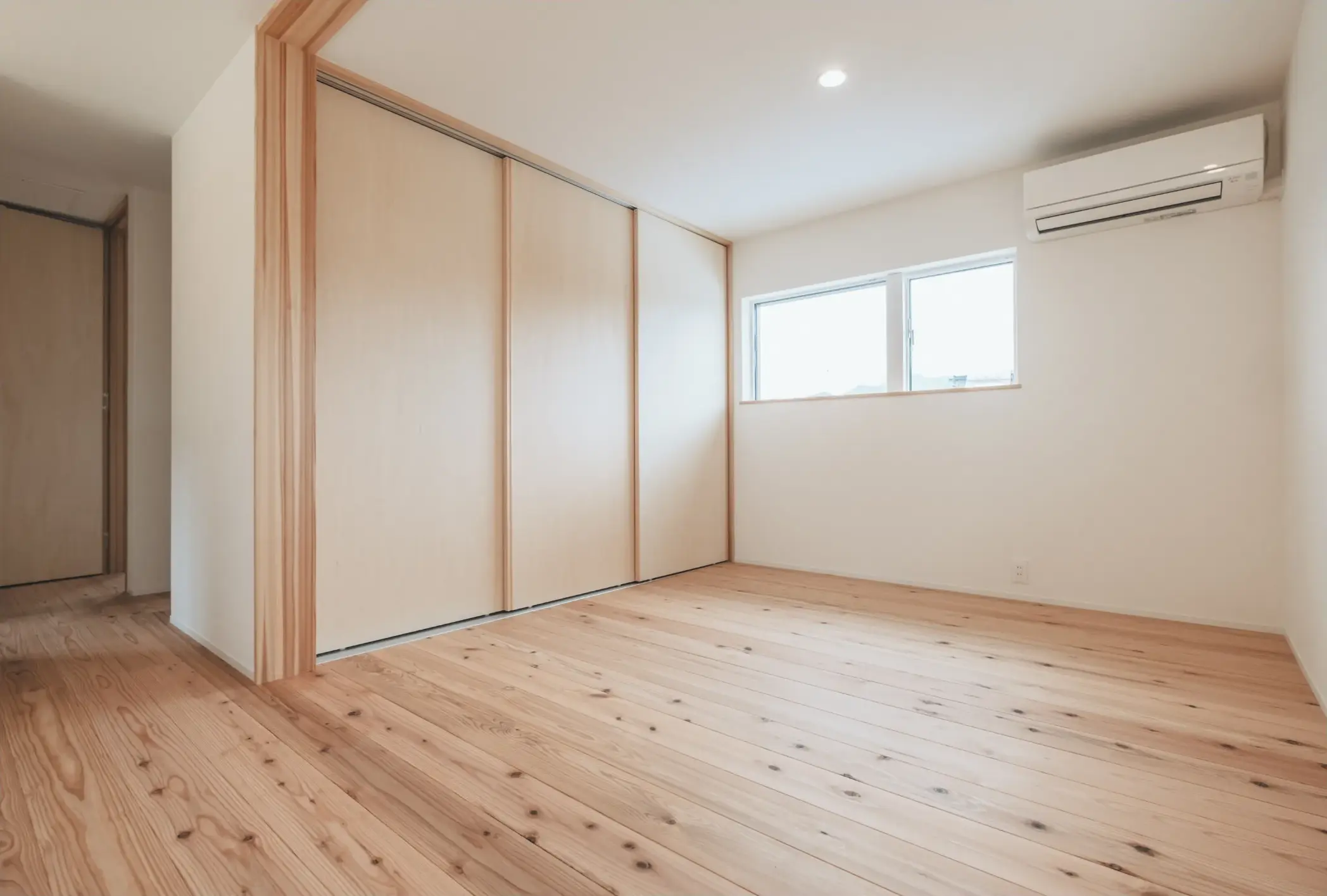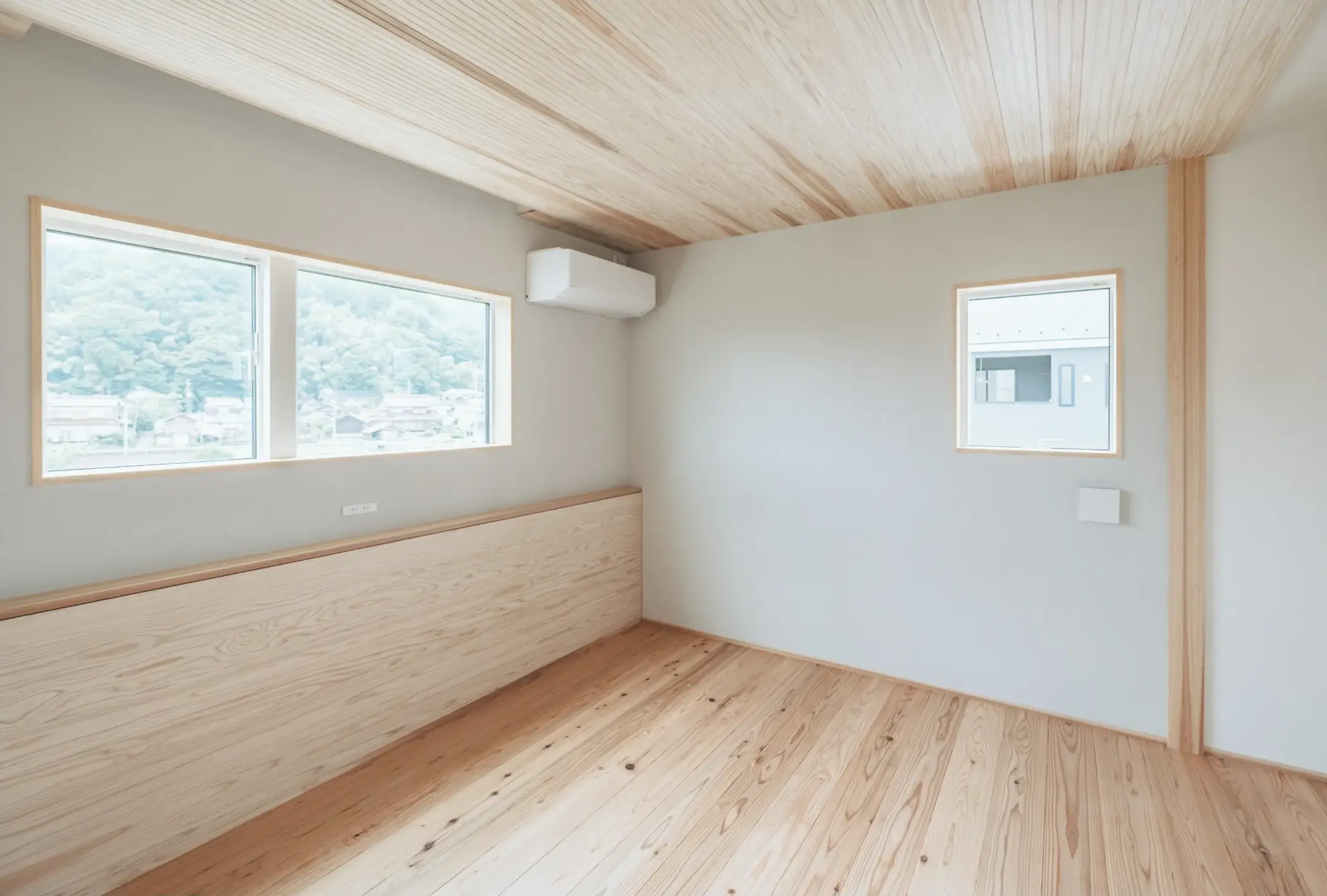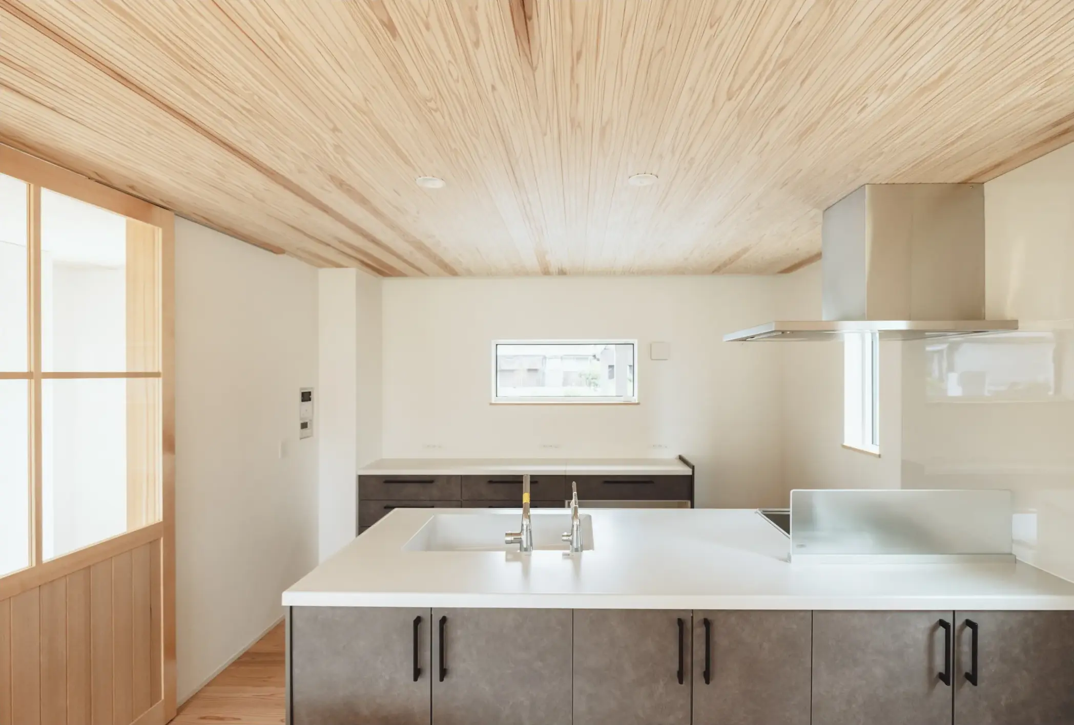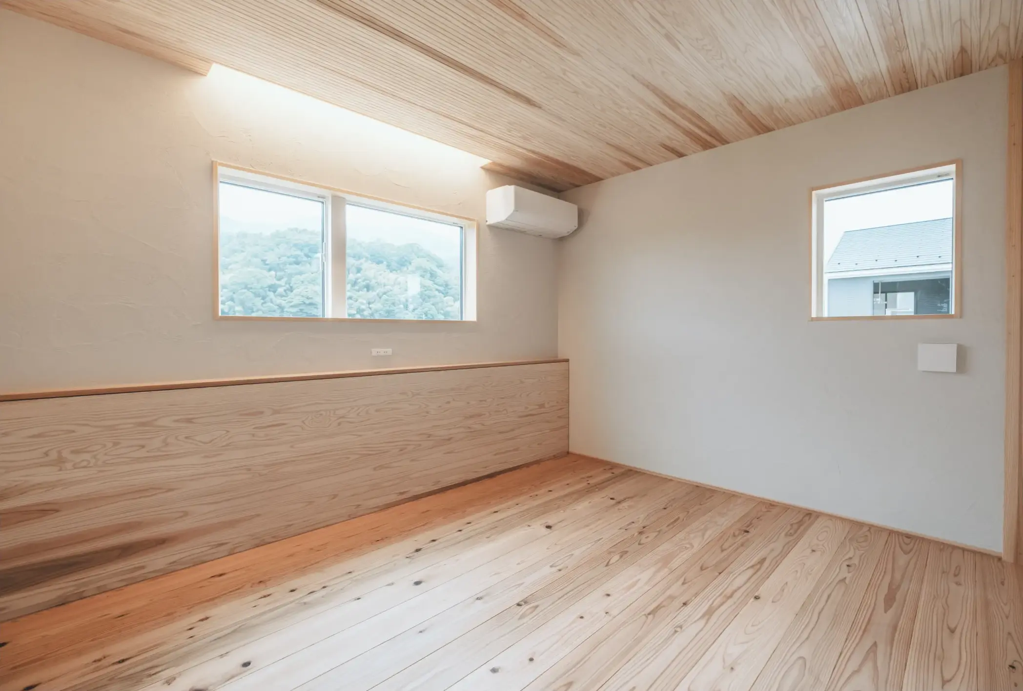 山と川の景色が、日々の暮らしの背景になるよう、窓の位置や視線の抜けを丁寧に整えました。室内にいながら四季の移ろいを感じられます。リビングは天井を高くとり、やわらかな光が空間全体に広がる設えに。無垢材の床や天井は、光を受けて表情を変え、時間とともに暮らしに馴染み、味わいを深めていきます。借景に取り込んだ自然、無垢の質感、吹き抜けの空間。それらが調和し、心が静かに落ち着く住まいとなりました。